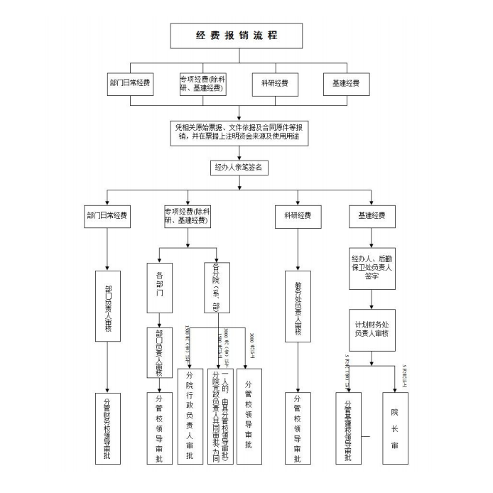 十三、学校基本建设经费支出,经经办人、后勤保卫处 负责人签字、计划财务处负责人审核后,由分管基建校领导审批。单笔基本建设经费开支在5万元以上的,需院长审。