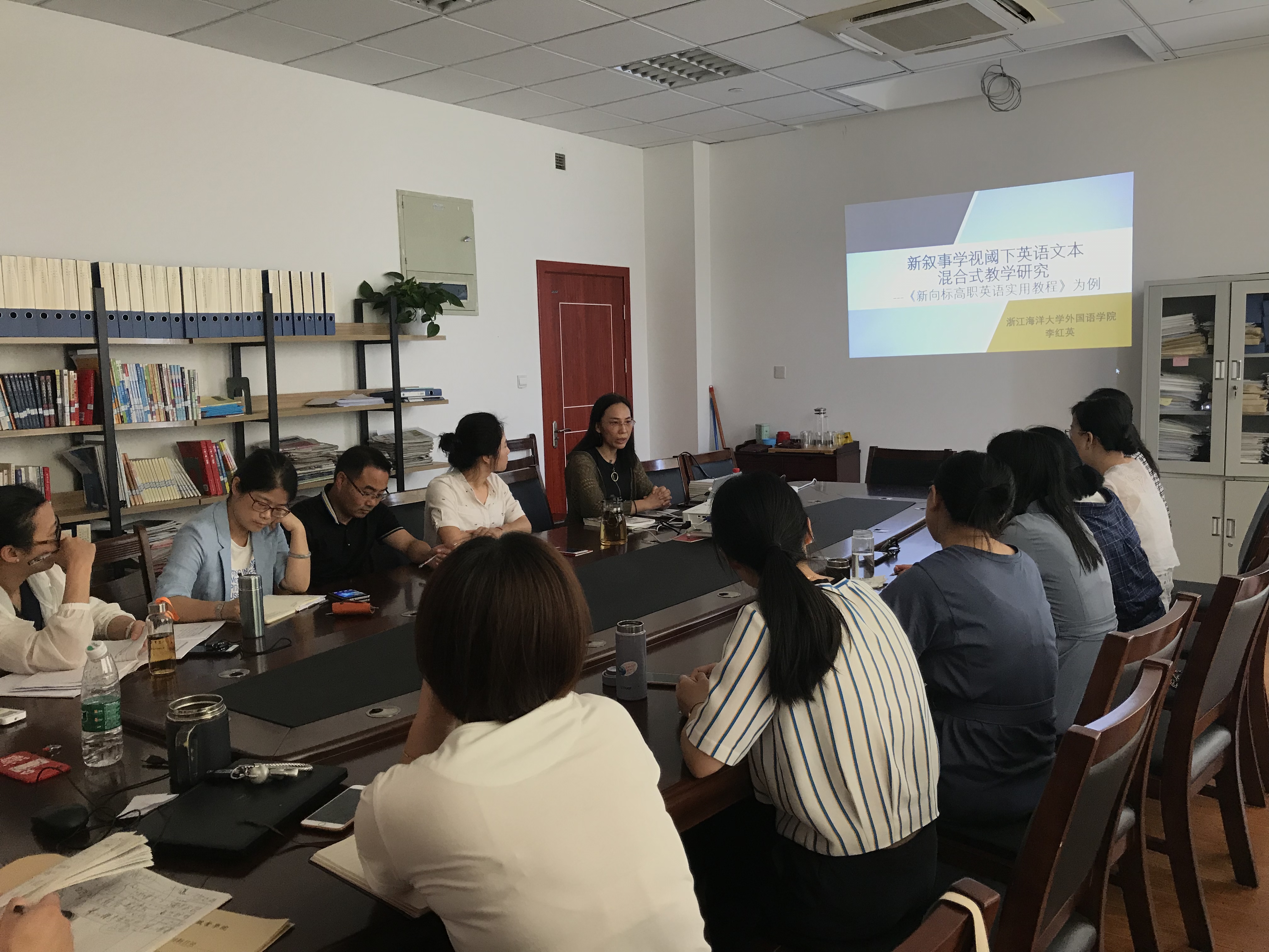 为进一步加强公共教学部基础课程建设,提升基础课教师教学能力,促进课堂有效教学,7月4日上午,公共教学部特邀浙江海洋大学外国语学院李红英副教授为部门全体教师进行“新叙事学视阈下高职英语文本学习混合式教学研究---以《新向标高职英语实用教程》为例”讲座。公共教学部负责人刘杨携部门全体教师认真聆听了讲座。
